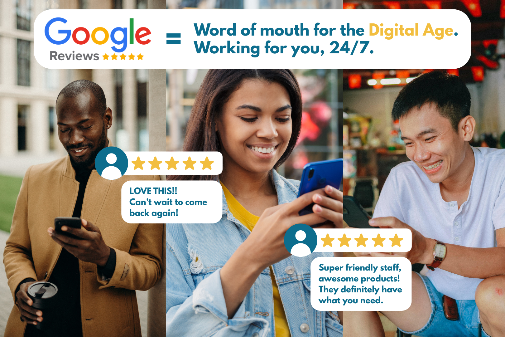 Think of Google reviews as word-of-mouth for the digital age. They don’t just sit on your profile — they work for you 24/7.