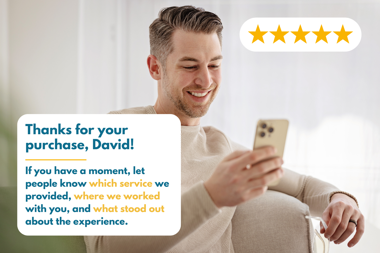 “If you have a moment, let people know which service we provided, where we worked with you, and what stood out about the experience.”